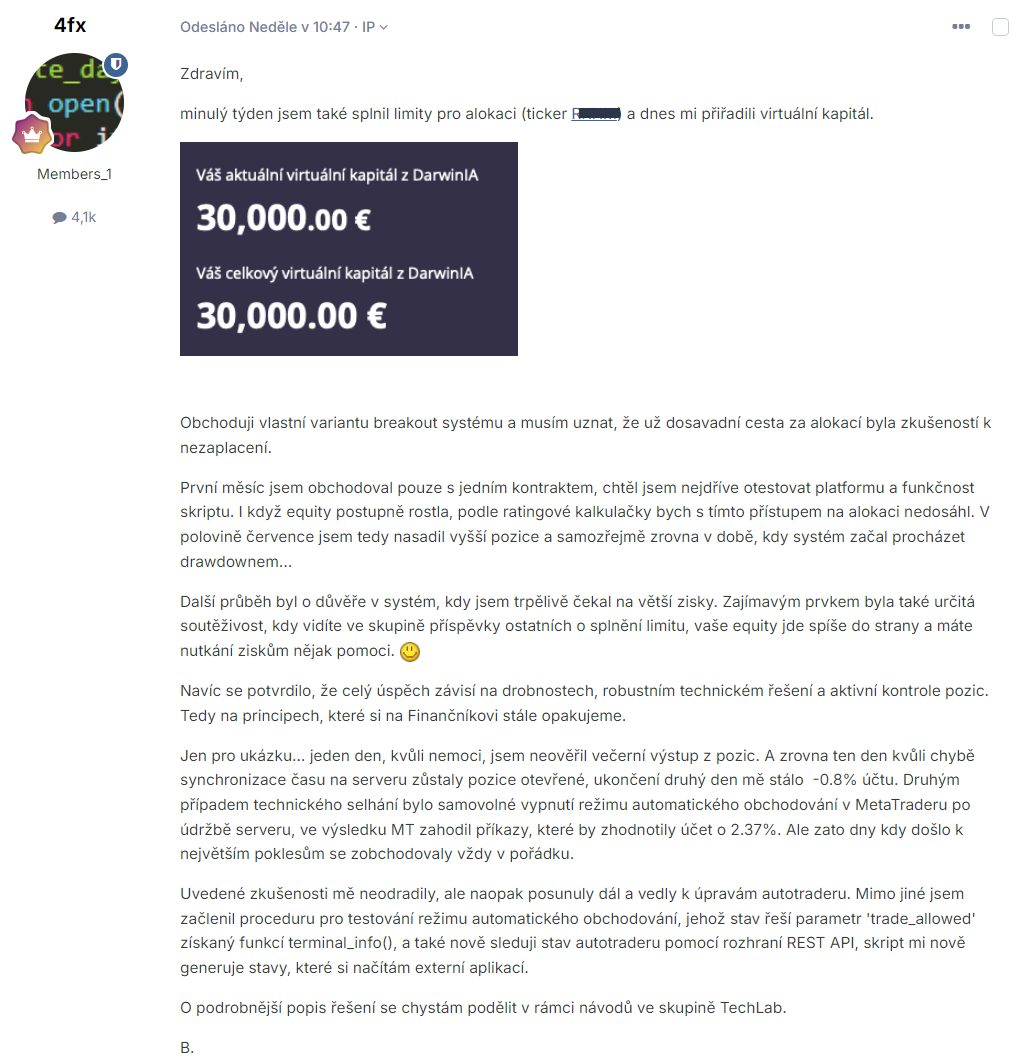 Před dvěma měsíci jsem si tak otevřel účet u Darwinex Zero, začal obchodovat milionové intradenní portfolio sdílené v Trading Room a od září získal první alokaci 30 000 euro.