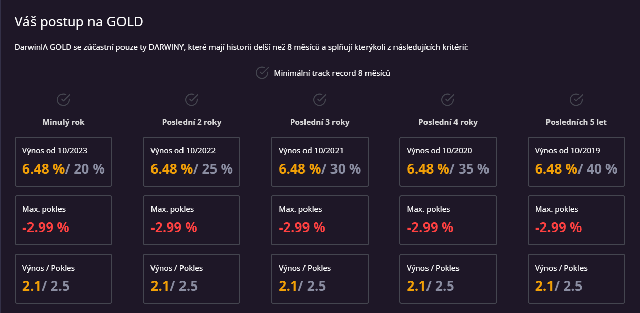 Jakmile bude na účtu delší historie dat, můžeme se přesunout do úrovně GOLD (do té potřebuji vygenerovat alespoň 20 % za poslední rok s poměrem výnos/drawdown dle následující tabulky. V té jsou zobrazeny mé aktuální výkonnosti):