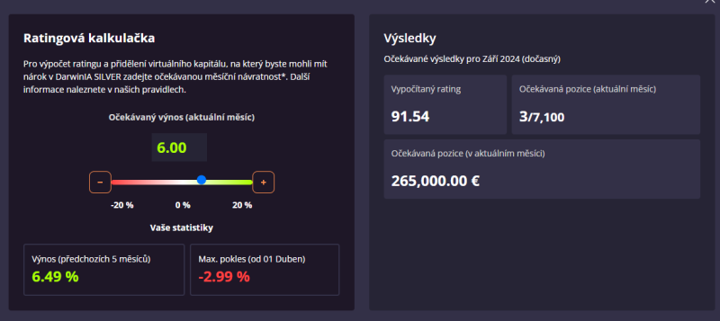 Pokud by se mému systému zadařilo hodně a dostal se na špičku žebříčku v Darwinex Zero, alokace povyroste výrazně. Takto vypadá například kalkulačka v momentě, kdy bych příští měsíc vydělal 6 %. Sice to není pravděpodobné, ale také ne úplně nereálné: