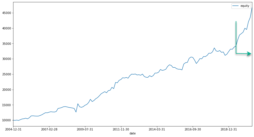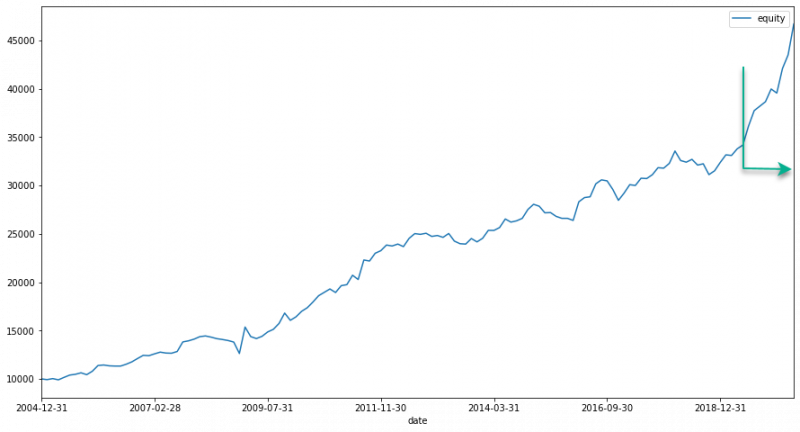 Na screenshotu je zelenou křivkou označená část equity křivky odpovídající vývoji strategie po jejím publikování v posledním článku.