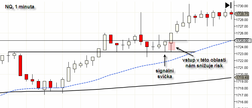 V trzích jako NQ, ES nebo YM se trh často na S/R úrovních vrací „tam a zpět“ než se finálně rozjede. Místo vstupu na close signální úsečky (pattern obchodního systému), mohu zkusit vstoupit v místě, kde budu mít risk odpovídající mému obchodnímu stylu. A nezapomeňte – tím, že si snížíte risk, si současně můžete dovolit obchodovat pro menší pohyb (bude zachováno RRR), kterých je v trhu vždy více než těch velkých.
