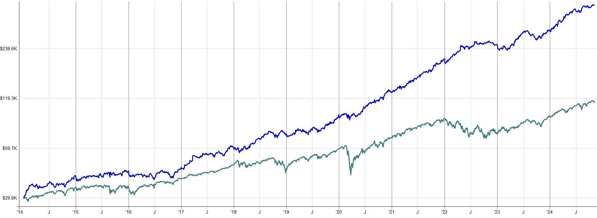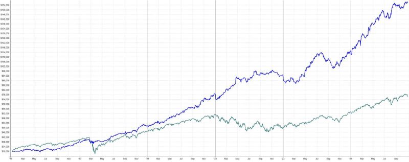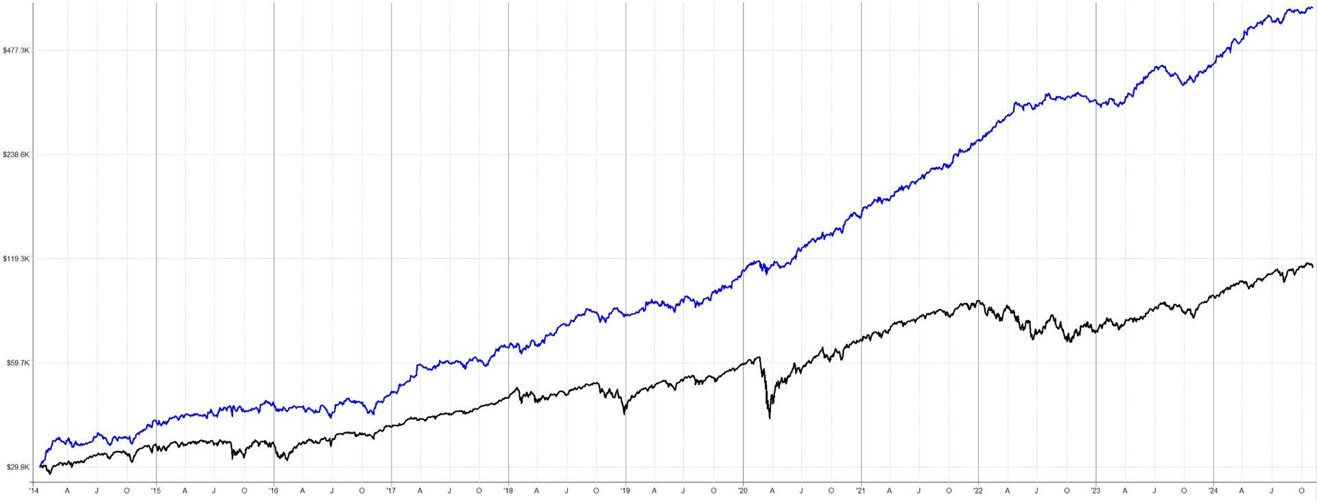 Modrá linka představuje výkonnost portfolia, černá linka referenční benchmark v podobě držení ETF SPY (graf je v logaritmickém měřítku).