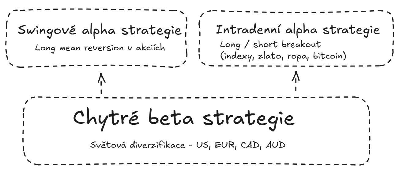 Beta strategie samy o sobě mají šanci překonávat indexy (navíc s příznivějším risk profilem). Nicméně v období tržních propadů často kapitál nevyužívají (nemají otevřené pozice). Proto tyto strategie kombinuji s alfa strategiemi.