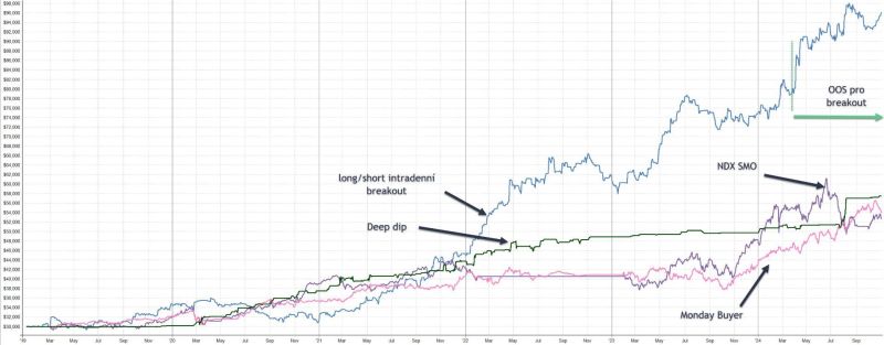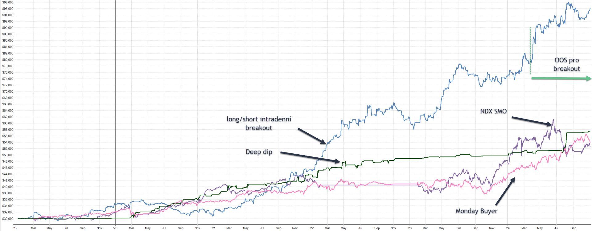 Strategie NDX SMO a Monday Buyer jsou na Finančníkovi sdíleny v aktuální podobě od roku 2019. Pro tyto strategie je tak období od 2019 jednoznačně „out of sample“. Intradenní breakout je pak OOS od dubna 2024.
