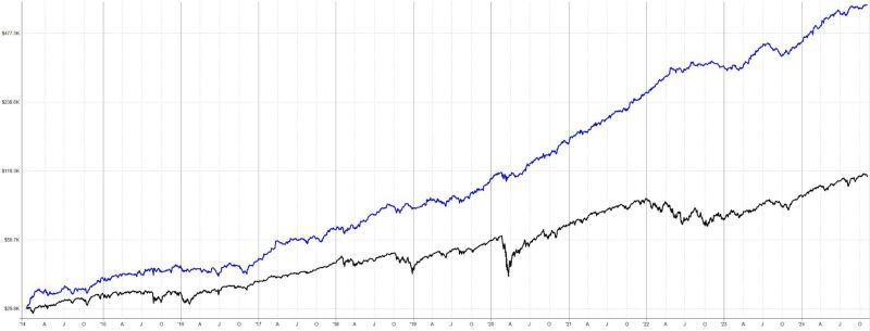 Takto vypadá výkonnostní křivka portfolia (s každoročným výběrem 15% zisku za předcházející rok pro zaplacení daní) v porovnání s držením SPY. Komise a slippage jsou započítány ve výše uvedené výši: