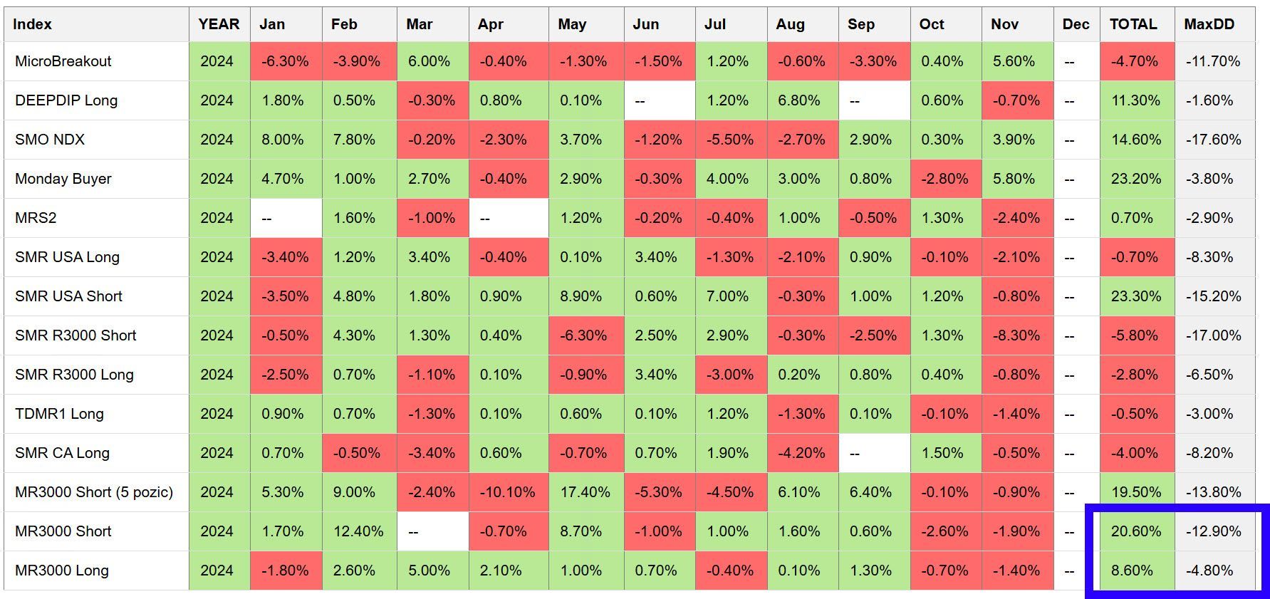 Osobně na svém účtu obchoduji MR strategie MR3000 short/long a jak je vidět, tak modelová MR3000 Short měla i letos slušný rok.