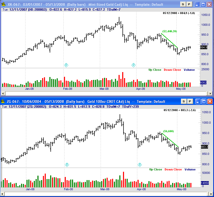 Porovnání „plného“ zlata (dole) a „zmenšeného“ kontraktu (nahoře). Na první pohled je vidět, že zmenšený kontrakt může být velmi zajímavou alternativou pro swingové obchodování.