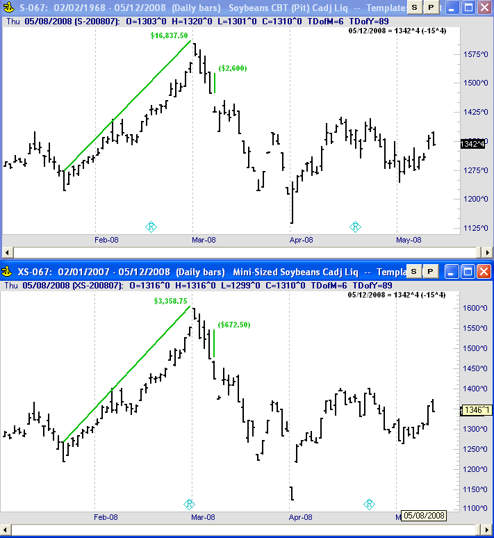 Orientační porovnání komoditních trhů Soybeans a mini-sized Soybeans. Pro ilustraci je uvedeno i „cenové měřítko“. Na první pohled je zřejmé, že pro obchodování „mini“ verze trhů je třeba menší stop-loss a tudíž i menší účet.