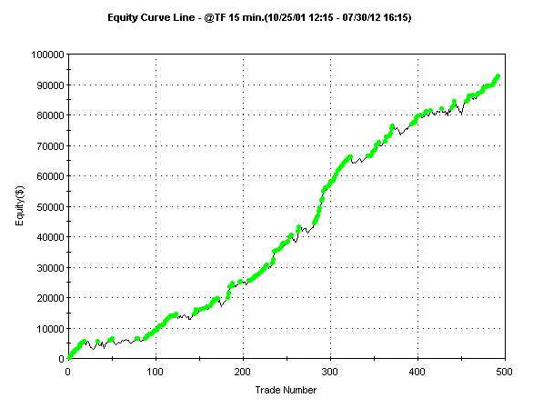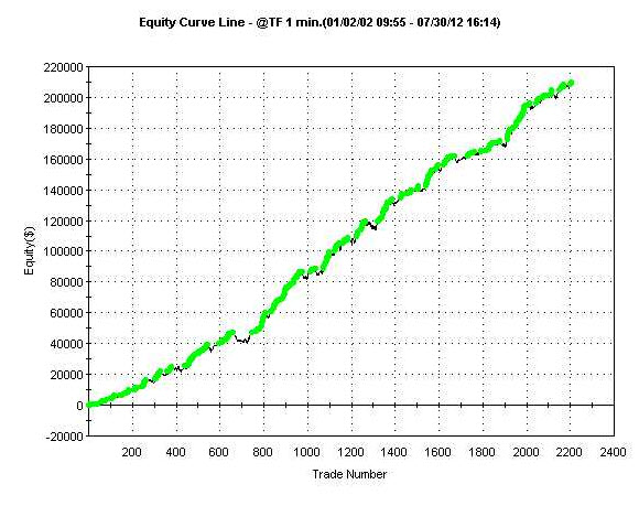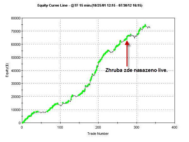 Při průměrném obchodování 3 kontraktů na obchod tedy equity mé variace systému vypadala zhruba následovně (v reálném obchodování z různých důvodů vypadala equity trochu hůře):