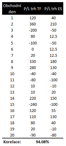 Začít můžeme například tak, že si vezmeme denní zisky z trhu TF a denní zisky z ES za nějaké (ideálně co nejdelší) časové období a necháme si vypočítat vzájemnou korelaci. Zde jsem připravil hypotetický příklad se vzorkem 20 obchodů – nejedná se o reálné obchody, ale i přesto by vzájemná distribuce zisků a ztrát v obou případech mohla klidně takto nějak podobně vypadat: