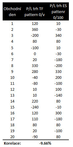 Můžeme se tedy například rozhodnout zkusit jít na to trochu jinak: na trhu TF zůstaneme u patternu FinWin 0/v, v trhu ES však tento trendový pattern vyměníme za nějaký protitrendový – například FinWin 0/100. Zkusíme opět vzájemnou korelaci – opět přináším modelový příklad, jak například by taková čísla mohla vypadat: