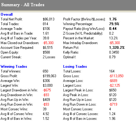 Jak je z ukázky patrné od roku 1987 by tento jediný pattern vydělal 86 013 USD na jeden kontakt, při úspěšnosti 79.9%, což znamená, že drtivá většina veškerých obchodů by končila se ziskem.
