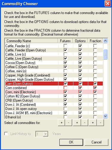 Podle svých preferencí si zde můžete vybrat komodity, které vás zajímají, případně omezit jejich historii na určitý počet let. Pokud máte rychlou linku a velký disk, patrně není důvod se příliš omezovat, aktualizace všech dat trvá i na pomalejším připojení pouze několik minut. Máte-li k dispozici modul pro práci s opcemi, můžete si nechat stahovat také data opcí. Sloupec Fraction (zlomek) udává, v jakém formátu se mají data stahovat. Je-li políčko zaškrtnuto, budou se data stahovat ve formátu zlomku (např. 9 1/2), v opačném případě bude použit desetinný tvar (např. 9,5).