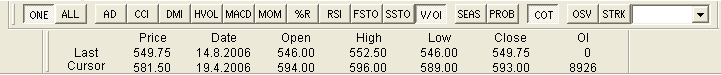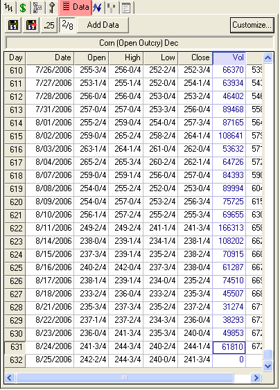 Tabulka Data je sama o sobě velmi praktickou pomůckou a umožňuje zobrazování i číselných hodnot nejrůznějších výpočtů (indikátorů, Commitments of Traders, ceny opcí atd.). Sloupce, které chcete v tabulce zobrazit můžete navolit přes tlačítko Customize.... Zobrazené hodnoty lze i snadno přenášet např. do Excelu pro další výpočty - stačí do tabulky kliknout, zvolit všechna data (Ctrl A) a následně data zkopírovat přes schránku (nejprve Ctrl C v programu Gecko TnT, a poté Ctrl V např. v Excelu).