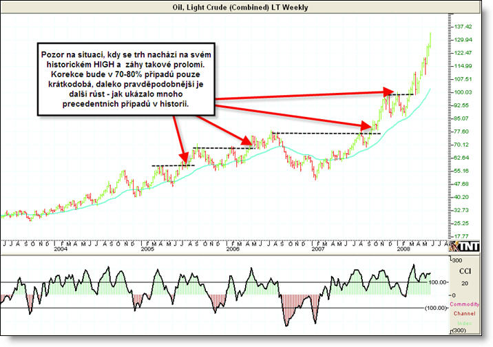 Na druhou stranu, trhy na svých nových vrcholech nabízejí často velmi dobré obchody, neboť při troše pozorování můžete sami vidět, že nová high mají tendenci tvořit opět nová high. Jinými slovy, co začalo růst do nových výšin, často se jen tak nezastaví – jak můžete například vidět na aktuální situaci v trhu s ropou. Pokud bychom tedy měli přejít k praktické aplikaci obchodování historických high, musíme v prvé řadě vzít v potaz, že z historických high jenom zřídka dojde k dlouhodobému otočení trhu, pokud tomu nepředchází nějaká výraznější situace, jako například dlouhodobější stagnace na určitém vrcholu kombinovaná s protitrendovými formacemi typu double top. To tedy znamená, že spekulace na short v momentech nových vrcholů je nejenom silně kontrariánská (na čemž není nic špatného), ale především aplikovatelná pouze v rámci krátkodobějších obchodů, ze kterých musíme umět velmi rychle vystoupit.