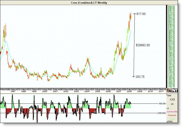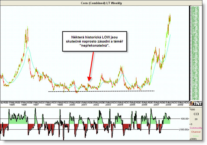 Situace u historických low je malinko jiná. V prvé řadě, kdykoliv se chystáme vstoupit do obchodu, musíme pohlédnout na týdenní a měsíční graf a podívat se, na jaké úrovni se nachází historicky nejsilnější support úroveň. Taková totiž může být velmi významná – jak se můžete přesvědčit například na grafu kukuřice. Konkrétně u tohoto trhu se již 15-20 let trh nedostal pod hranici supportu 200 a tak je toto historické low kriticky důležité. U takto silných historických low se z vlastních pozorování a závěrů domnívám, že další pokles je skutečně pouze minimálně pravděpodobný a tak bych osobně nikdy nespekuloval na short v trzích, které se nacházejí na tak silném hisotrickém low, jako kukuřice v letech 2005 a 2006 (a samozřejmě ještě dříve v minulosti). To tedy znamená, že jakýkoliv prodej kukuřice blízko oblasti 200 by byl pro mě naprosto tabu.