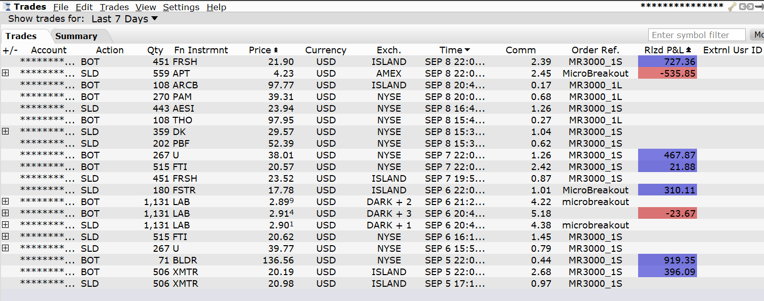 Screenshot živých obchodů platformy Interactive Brokers. Barevně podbarvená pole udávají zisk (modře) a ztrátu (červeně) uzavřených obchodů. Reportováno v USD.