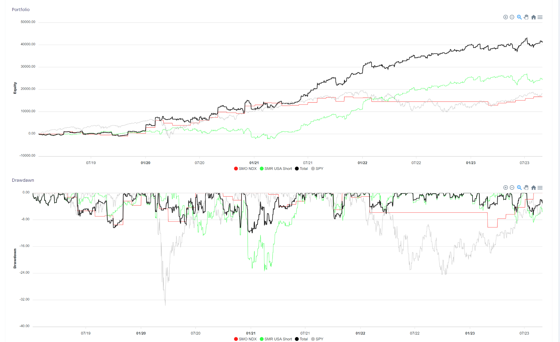 Je vidět, že krátkodobě opět nejvíce vydělávají shorty (jde o klon swingové „Simple mean reversion“ strategie, ke které na Finančníkovi poskytuji i otevřené kódy). Ty pěkně doplňují dlouhé pozice, které mám otevřené dlouhodoběji – např. ve swingové trendfollowingové MicroBreakout strategii (long breakout na méně likvidních akciích) a momentum SMO (rotační strategie držící technologické strategie s nejvyšším momentem – ta mimochodem letos v portfoliu vydělává snad nejvíce).