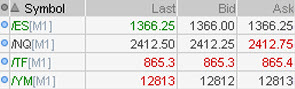 Na obrázku vidíte přehled ceny Last, Bid a Ask celkem 4 trhů. Pokud bychom v okamžik, kdy byly hodnoty na obrázku aktuální, chtěli nakoupit daný komoditní kontrakt (jednoduše tak, že stiskneme tlačítko BUY MARKET), pak není možné si nevšimnout, že u trhů NQ (e-mini NASDAQ) a TF (e-mini Russell 2000) bychom nakoupili o jeden tick hůře (viz cena Ask) oproti ceně, kterou právě vidíme na grafu jako poslední zobchodovanou (LAST). Pokud bychom tedy například obchodovali obchodní systém FinWin, s tím, že vstupujeme na close úsečky příkazem Market, pak bychom v momentě vstupu sice viděli na grafu hodnotu 865.3, ale ve skutečnosti bychom nakoupili minimálně za 865.4, což je o 10 dolarů na kontrakt horší plnění oproti ceně Last.