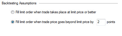 Rád bych ještě věnoval trochu prostoru backtestování v případě použití příkazu Limit. Jak už jsem zmínil, backtestování v případě tohoto příkazu vyžaduje určitá specifika (a ani tak nemáme zaručeno, že by náš backtestový obchod byl vyplněn). Nejdůležitější je zapsat obchod jako vyplněný pouze v případě, že se trh vrátil alespoň o několik ticků pod naší plánovanou cenu (v případě obchodu na stranu long). Doporučuji alespoň 2 ticky (i když ani tak nemáte zaručené plnění - občas se cena vrátí jenom na krátký moment a stihne exekuovat pouze minimální množství Limit příkazů).