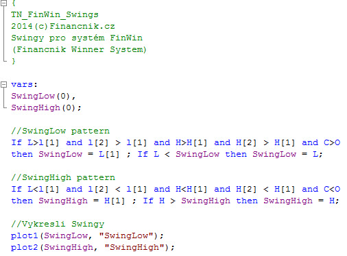 Takže, pojďme na to. Dnes začnu rovnou tím, že představím svůj kód pro swingy (znovu podotýkám, není to žádná novátorská technika, podobné kódy už určitě existují, jen tento popis swingů mně opakovaně vychází jako jeden z nejoptimálnějších, takže prezentuji to, k čemu jsem došel při svých vlastních experimentech já sám). Toto je tedy má doporučená varianta swingů pro systém FinWin, kód pak jako vždy prezentuji v podobě pro platformu TradeStation (pro jinou platformu kód k dispozici nemám, pracuji už pouze s TradeStation):