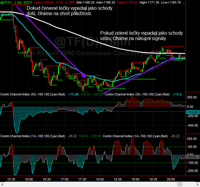 Zelené tečky nám vykreslují Low-Swingy, červené tečky High-Swingy. Zelená proto, že pokud nám Low-Swingy rostou, je trh nastavený pro obchodování na stranu long. Červená proto, že pokud nám High-Swingy klesají, je trh nastavený pro obchodování na stranu short. Vše by mělo být zřejmé z následujícího obrázku: