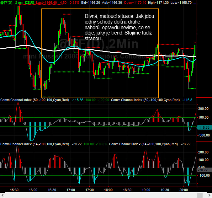 Tyto automatické swingy však můžeme využívat i k opačné věci – čtení situací, které nejsou jasné (trh nemá jasný trend), a tudíž se budeme raději držet stranou. Zde netřeba žádné složité definice, stačí si položit dotaz: Jsem ze struktury swingů na první pohled schopen jednoznačně říci, jakým směrem právě swingy tvoří "schody", případně jaké ze "schodů" právě silně převažují? Pokud nejsem schopen jednoznačněji odpovědět, situace není jasná, v trhu není jasný trend a my se držíme stranou: