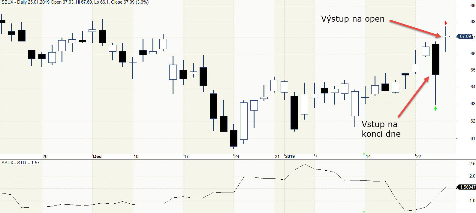 Už ze samotného pohledu na graf reagovali obchodníci v akcii SBUX 24.1.2019 na nějakou silnější událost. Trh vytvořil nestandardně velký pohyb a vůči ostatním akciím v indexu Nasdaq 100 uzavřel jako jeden z 5 nejslabších. Systém vstupoval na close takového dne a držel do open následujícího dne, který byl dokonce až nad high vstupní úsečky.