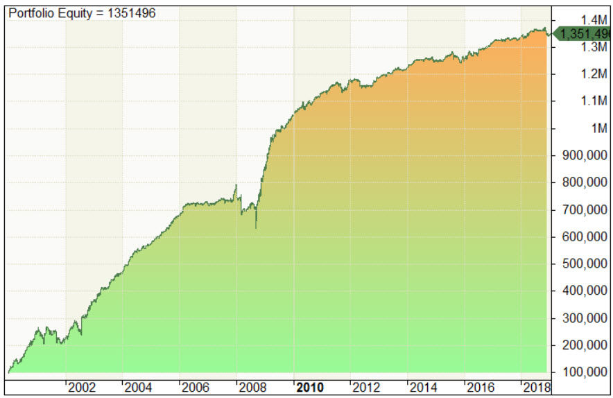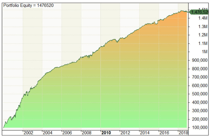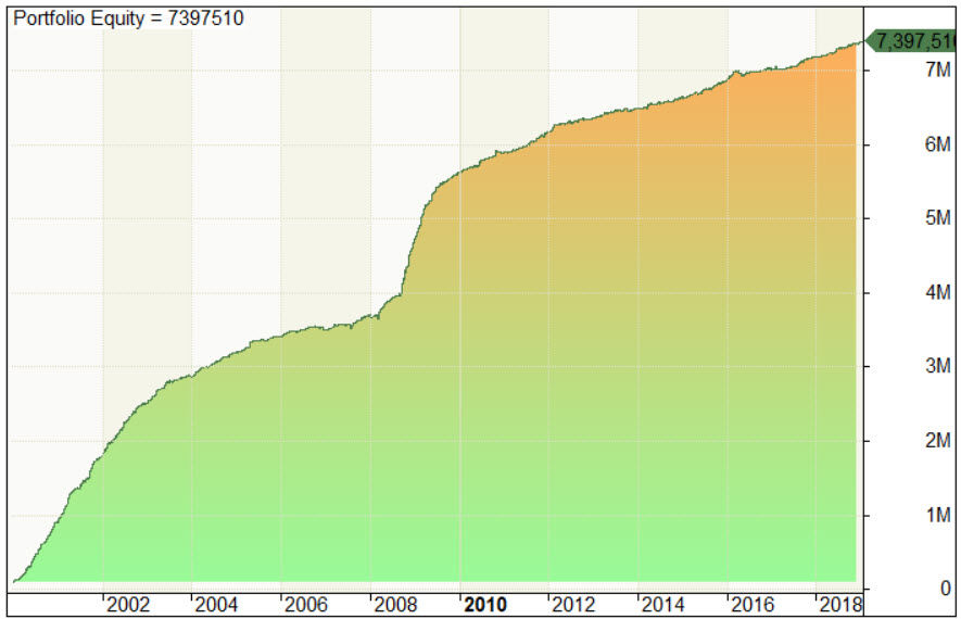 A zde je pro ilustraci equity křivka, která nepracuje s reinvestováním – tj. celou dobu se otevírají akcie s fixním kapitálem (při testu je zohledněna skladba indexu v historii):