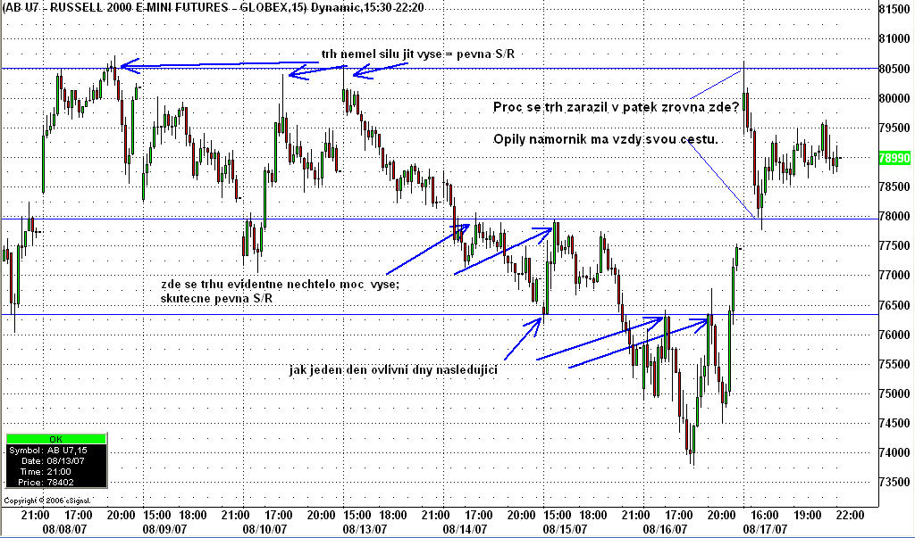 Je například docela logické, že pokud dostanu signál do dlouhé pozice těsně pod S/R úrovní, může tato mou pozici ohrozit. Budu se tedy snažit co nejrychleji posouvat SL na vstup v momentě, kdy vidím, že má trh problém dostat se přes tuto bariéru. A naopak – pokud trh protne tuto bariéru, pohlédnu k nejbližší další S/R a dle toho volím výstup. Řekněme, že standardně vystupuji na profit-targetu 300 USD, pokud ale vidím k další S/R úrovni potenciál 500, mohu zvážit držet dále a opět jen natěsno posunout SL. A nebo pokud vystupuji například na CCI hook, mohu zvážit prodloužení setrvání v obchodě a vystupovat až na překročení linky -100/100 směrem zpět do běžné oblasti. Pamatujte – opilý námořník většinou má svůj konkrétní směr, svůj bod, ke kterému kráčí. Je to jeho loď. A čím více se k této lodi blíží, tím více má vnitřních sil k ní dojít – pokud je již tedy jeho loď velmi blízko, je skutečně vysoká pravděpodobnost, že dojde až k ní. Se supporty a resistencemi je to naprosto stejné.