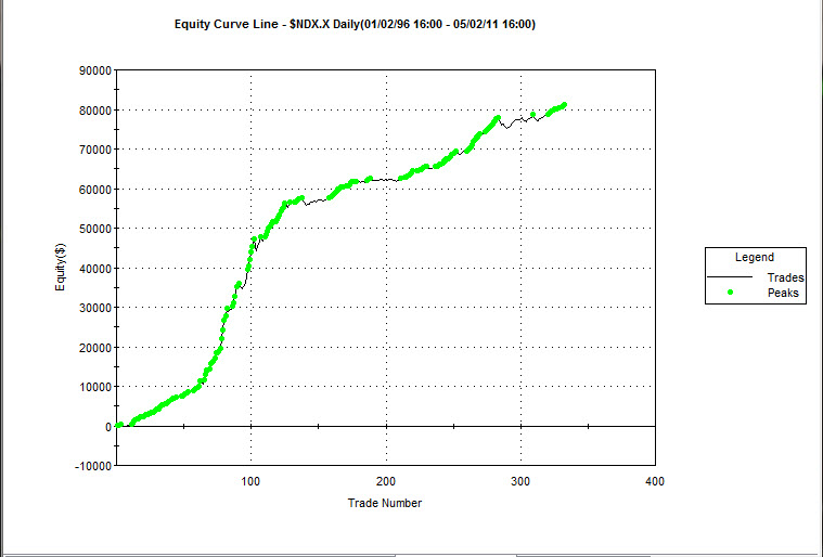 V nedávné době jsem při využívání genetických algoritmů narazil na velmi jednoduchý systém, který je založený na RSI, vykazuje poměrně robustní výsledky na celé řadě trhů, dlouhodobou profitabilitu, navíc funguje s různými parametry, takže se v žádném případě nejedná o nějaký přeoptimalizovaný nesmysl. Jediná "dobnost" byla ta, že systém nepoužívá stop-loss a přidání jakéhokoliv rozumného stop-lossu začalo systém drasticky zhoršovat. Nejlepší výsledky dával systém (bez stop-lossu) obecně na akciových indexech, zejména na indexu NDX (NASDAQ 100). Konkrétní equity vypadá takto: