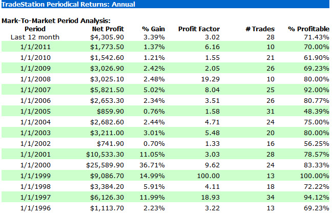 Průměr téměř 77% při podobné funkčnosti na stranu long i short a profit faktoru 4.54 je určitě v mnoha ohledech nadstandardní výsledek, takže z tohoto pohledu se jedná skutečně o potenciálně velmi zajímavý systém. I bližší pohled na výsledky od roku 1996 (15 let na zpět - jedná se o poziční systém obchodovaný na denních datech) ukazuje rozumnou stabilitu i pozitivní fakt, že systém neměl v minulosti jediný ztrátový rok.