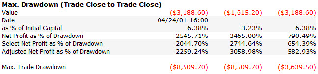 Ale jak už to tak bývá, každé pro má i své proti. A čím silnější je pro, tím silnější může být proti. Kde je tedy "háček"? Háček je v tom, že při posuzování drawdownu jsme až doposud zvažovali pouze hodnotu v rámci konce dne. Nikoliv však hodnotu v rámci samotné obchodní seance, která může být (a často bývá) drasticky jiná, než ta na konci dne. Takže, pojďme si nyní přidat screenshot s maximálním drawdownem v rámci obchodní seance (tj. v rámci otevřeného obchodu):