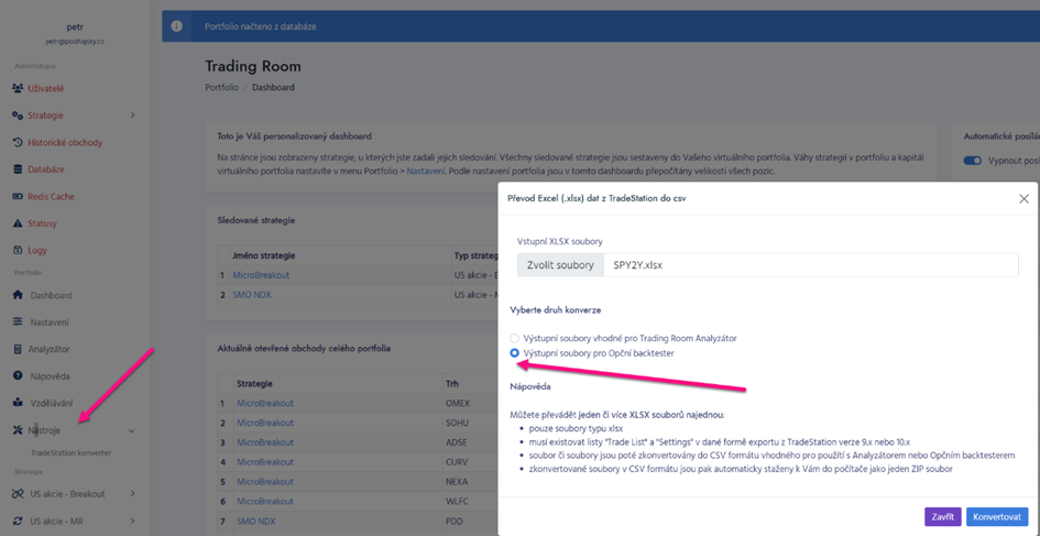 Testujeme v programu TradeStation. Pro něj jsme v Trading Room vytvořili workflow, které nám umožňuje převést výsledky backtestů z TradeStation do formátu pro opční backtester: