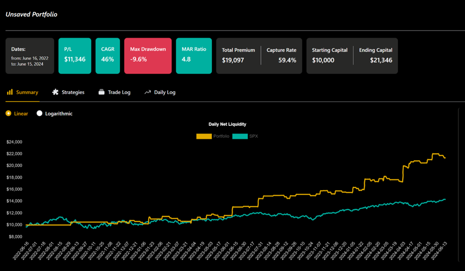 V případě opčního backtestu je aplikován stejný position sizing jako u ETF v TradeStation – zisky nejsou reinvestovány a riskuje se 300 dolarů/obchod.