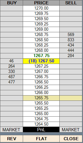 Z DOMu na screenshotu je patrné, že aktuální cena trhu je 1267.50 (žlutá oblast). V prostřední cenové škále jsou uvedeny i další informace týkající se aktuální ceny (různými barvami jsou vyznačeny aktuální bid/ask ceny, v závorce je uvedeno kumulovaný objem pro daný bid/ask. Co je bid/ask viz článek Hodnoty bid a ask v intradenním obchodování). Co ale znamenají čísla uvedená nad a pod aktuální cenou?