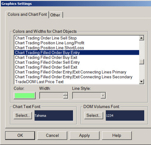 Graficky atributy týkající se zobrazování uskutečněných obchodů lze v Sierra Chart nastavovat na několika místech. V Global Settings > Graphics Settings si můžete nastavit barevnost šipek vyplněných příkazů, linek v grafu atd. Jde o volby začínající slovy Chart Trading… :