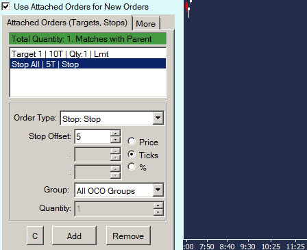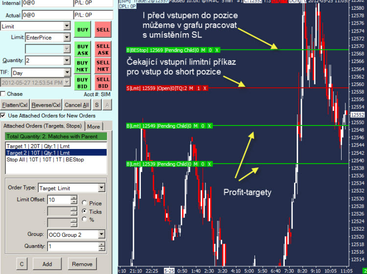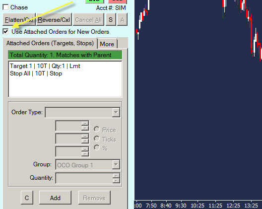 Sierra Chart samozřejmě umí nastavovat automatické stop-lossy a profit-targety – jde o tzv. „Attached Orders“ (připojené příkazy). Pro jejich použití je nejprve nutné zaškrtnout „Use Attached Orders for New Orders“ a následně budou do trhu zadávány po exekuci vstupního příkazu čekající příkazy dle specifikace uvedené v okně Attached Orders (Targets, Stops). V našem příkladu se tak do trhu umístí profit-target v oblasti 10 ticků a stop-loss 10 ticků: