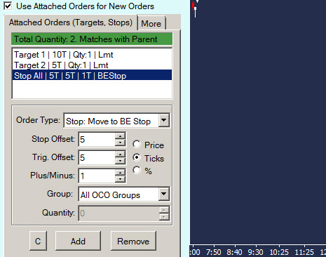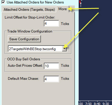 Sierra Chart umí i různé velmi pokročilé typy práce se stop-lossem a profit-targetem. Je možné měnit typy příkazů, nastavovat OCO vazby jen mezi určitými příkazy atd. V záložce „More“ si můžete konfigurace svých příkazů ukládat, případně mezi uloženými konfiguracemi naleznete některé nejběžněji používané typy nastavení. Např. si můžete vybrat 2TargetsWithBEStop.twconfig, který vám přednastaví šablonu pro obchodování 2 kontraktů s tím, že oba vystupují na jiném profit-targetu, a stop-loss se automaticky posouvá na B/E po dosažení určitého otevřeného profitu: