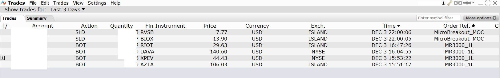 Pokud si pak vypíši jednotlivá plnění, mohu si Order Reference zobrazit jako samostatný sloupec. Takto například vypadají mé páteční obchody na účtu fondu: