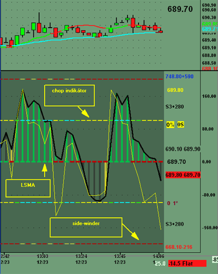 A konečně side-winder (SW) je čára na hranici −200/+200. Zde je interpretace trochu rozdílná, neboť side-winder měří převážně sílu trendu. Pokud má SW barvu zelenou, je trend velmi silný a signály do trendu se rozhodně vyplatí brát. Pokud je SW žlutý, trend příliš velkou sílu nemá, zde je již na každém obchodníkovi, zda-li do případného trendu vstoupí, nebo ne. Pokud je SW červený, pak je síla trendu minimální a měli bychom se držet od trhu opodál.