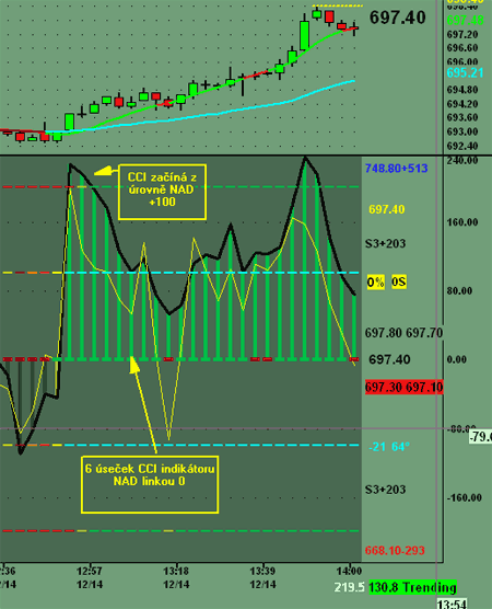 Na obrázku 4 vidíme ještě jednu situaci, kdy není možné považovat trend za právoplatný. I když došlo k naplnění pravidla číslo 1, tj. indikátor CCI utvořil alespoň 6 CCI úseček nad linkou 0, nedošlo k naplnění pravidla 2, aby počátek těchto 6 CCI úseček začínal nad hranicí +100. I zde tedy neobchodujeme a vyčkáváme na jasnější definici trendu.