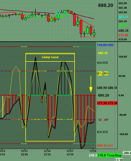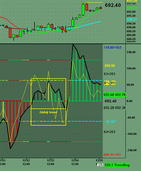 Na obrázku 3 vidíme situaci, kdy není v trhu etablovaný žádný trend. Indikátor CCI nám sice střídavě vytváří úsečky nad i pod čárou 0, avšak v žádném z případů nedošlo k vykreslení alespoň 6 úseček jedním nebo druhým směrem, proto nebyl trend etablován a proto v takovýto moment neobchodujeme. Od trhů bez trendu je obzvláště třeba držet se dál a v tomto případě nám pravidla potřebná k definici trendu ušetří mnoho zbytečných ztát.