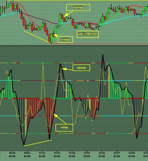 Z obrázku je jasně patrné propojení dvou vrcholů na grafu CCI a zároveň propojení vrcholů ve stejném časovém úseku na grafu trhu. Při pohledu na obě čáry vidíme, že nastala divergence. Čekáme tedy na překročení čáry −100 a poté vstupujeme příkazem buy do dlouhé pozice. Vystupujeme na CCI hooku (viz kapitola seriálu věnovaná výstupům).