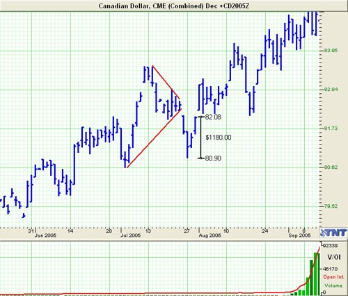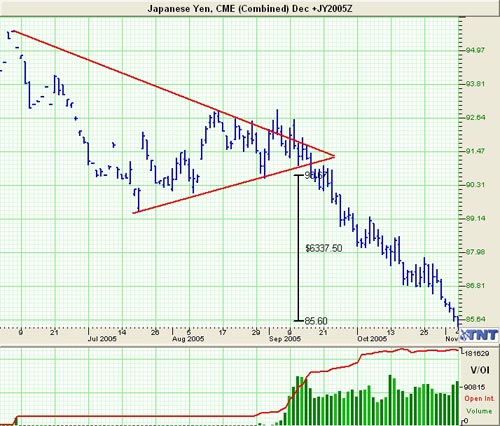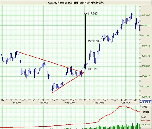 Ukázka trojúhelníkové formace; propojením dvou trendových čar vzniknul obrazec trojúhelníku, z jehož proražení v blízkosti špice vzniknul výrazný pohyb.