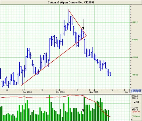 Všimněte si na obrázku, jak úsečka na špici trojúhelníku (viz šipka) vykazovala zároveň velmi nízké volume. Ihned po proražení špice trojúhelníku pak následovalo naopak volume extrémně vysoké.