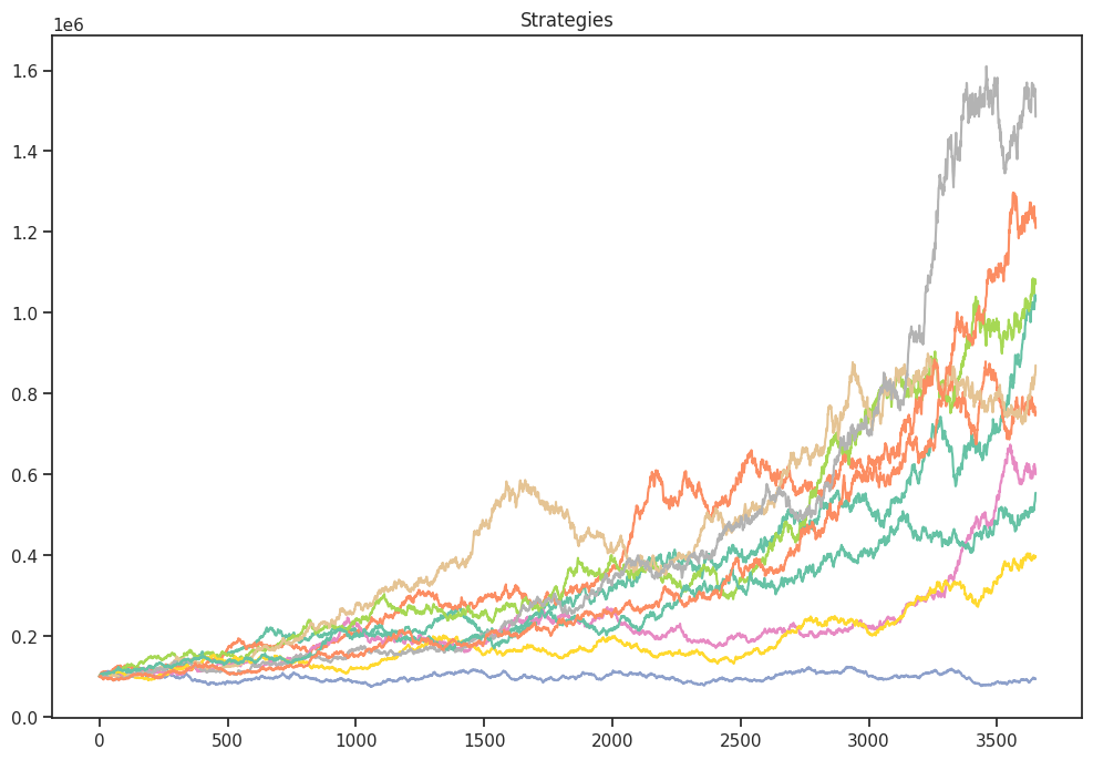 Hodnoty se pochopitelně liší s každým během skriptu (křivky jsou generovány náhodně), ale rámcově budou při stejných parametrech vypadat podobně. Zde vidíme, že drawdown systémů se pohyboval v rozmezí 21,95 – 40,15 %. Výnosnost od -0,69 % do 21,13 % (ano, jedna strategie ztrácela podobně, jako se nám to bude dít na živých účtech).