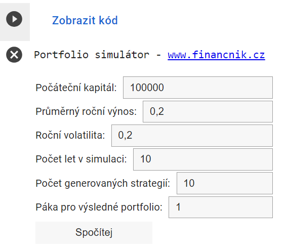 Prostředí je jednoduché. Skript generuje hypotetické systémy podle zadaných parametrů. Průměrný roční výnos 0,2 říká, že generujeme systém průměrně generující 20 % p.a. Pak je důležitá roční volatilita. Hodnota 0,2 stručně řečeno znamená, že můžeme očekávat drawdown cca 20-30 %. Dále zadáme počet let v simulaci a počet generovaných strategií.