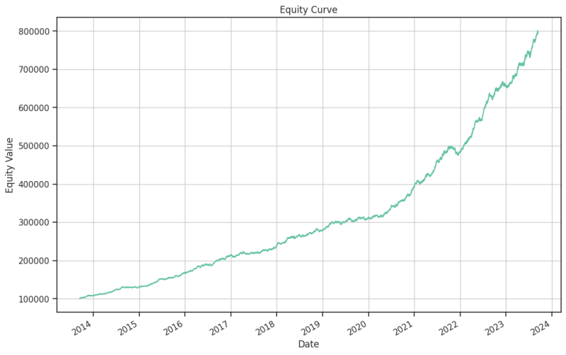 Řekněme, že bychom každé strategii přiřadili 1/10 kapitálu (na ukázce pracujeme s 10 strategiemi) a obchodovali je všechny najednou. Výkonnost portfolia by pak vypadala následovně: