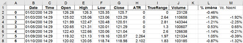 Do Excelu si vyexportuji data ze sledovaného timeframe. Mohu začít například denním, kde se budu určitě zajímat o běžné rozpětí, volume a procentuální změny. Tedy mohu mít data v Excelu v podobné struktuře (jde o data trhu CL v mé sledované seanci):